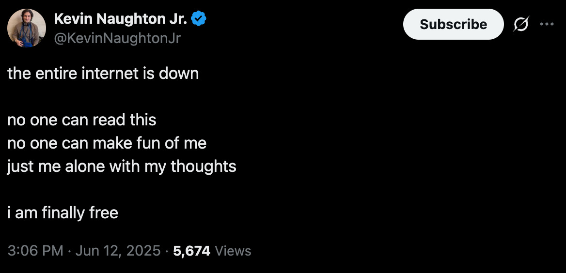 China stops exporting rare earth metals and we stop importing students and suddenly the US and China have the beginnings of the workings of a possible plan. A Robotaxi with no driver is spotted in Austin, TX. Eugenics goes mainstream. A normie helped patch things up between the most powerful man and the richest man in the world. Newsom does a Star Wars troll of Trump. A big chunk of internet services have an outage all at once, and some people decide they can look up from their phones.