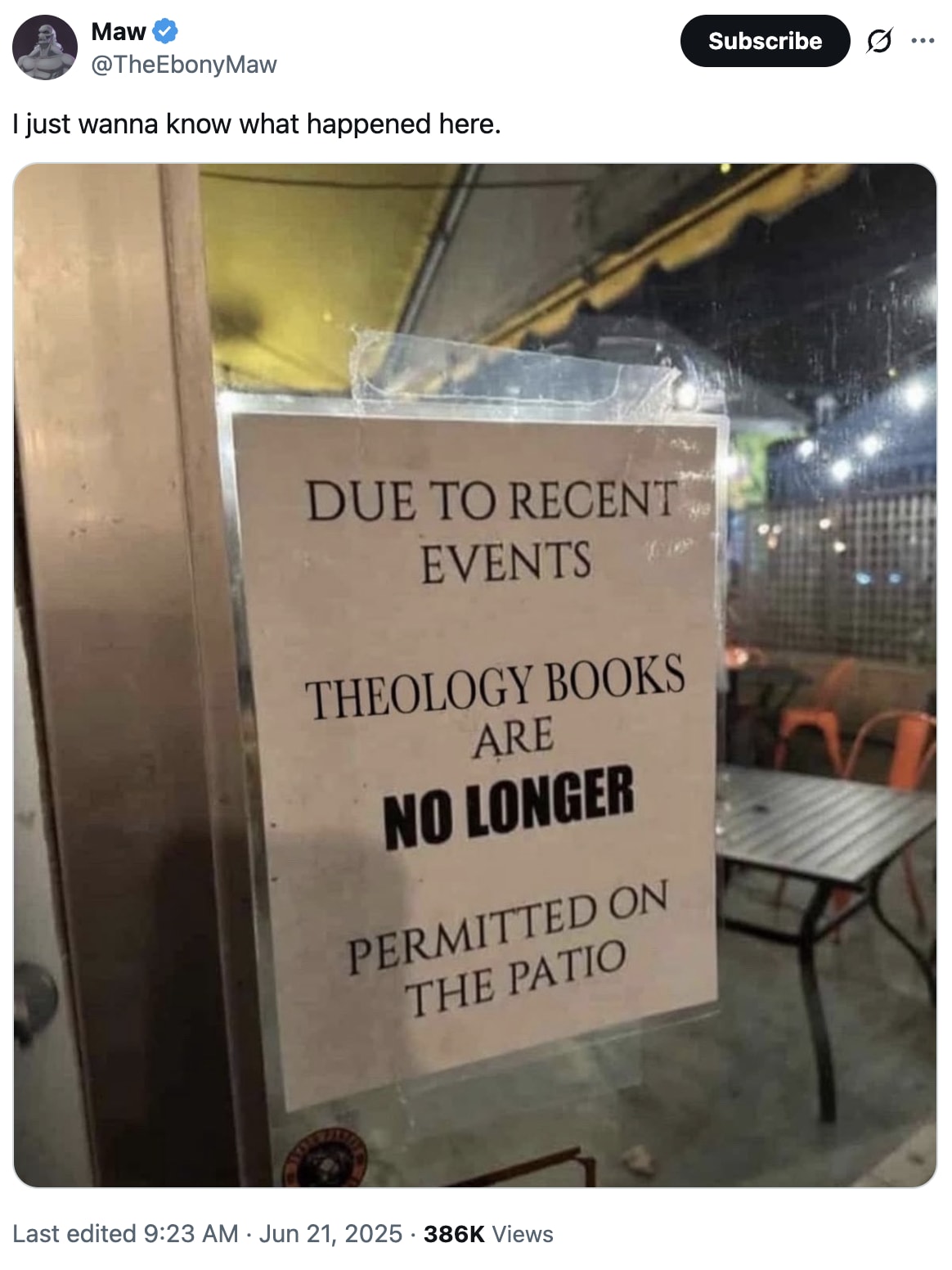 While we were here, Trump dropped some bombs. And the bomb strategy seems suspiciously like Jedi hitting the Death Star — targeted strikes on ventilation shafts. Some people are very upset about the bombs dropping on Iran’s nuclear weaponenergy program.. Some are debating if the bombs worked. Probably they did. The Pentagon affirms MOPs work as designed. Khameini starts tweeting again and congratulates himself on victory. Trump declares a ceasefire and then gets mad when the children keep making fisticuffs. He probably had to press the Diet Coke button. SECDEF doesn’t answer questions and retaliates.