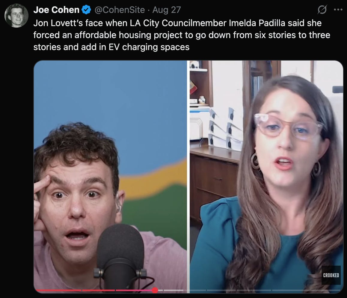 The head of the DIA was fired. No idea why, don’t ask. But also the director of the CDC. And there was the BLS director and NSA director awhile back. And also now one of the Fed chairs Lisa Cook. And this is all ridiculous and bad and I have to ask: where is the Legislature? Why must we have centralized Exec Branch power and nothing left in Congress? Well, Congress responded and it was sad and typical. The main problem, you see, is still that Lisa Cook is a black woman. It’s never about financial systems or anything, it’s always racism. So, the Dems are still fine. If you need more evidence, see Jon Lovett’s face melting as an LA councilwoman explains how she’s fighting for affordable housing by making sure there’s enough EV charging spots.