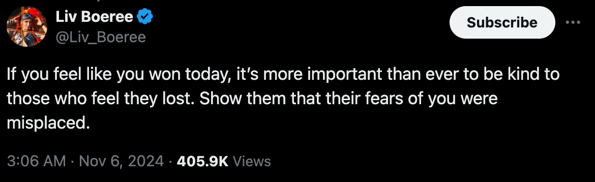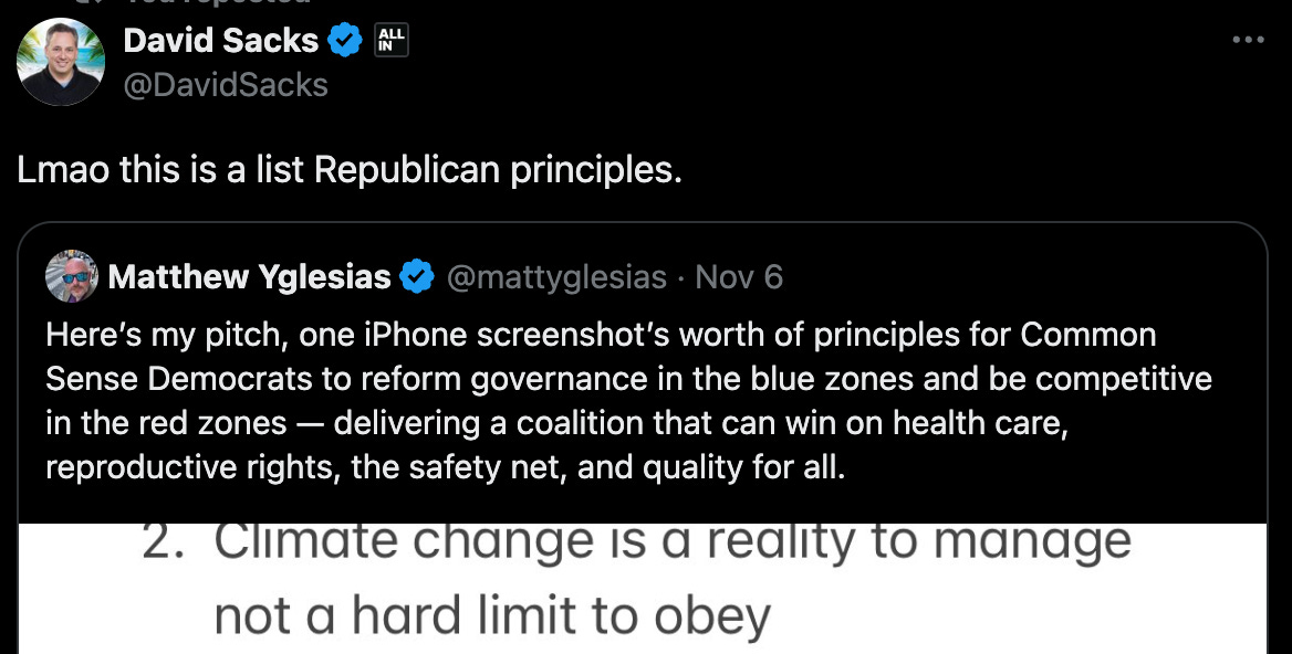 There were some overdramatic reactions to a Trump win and really, whether you voted Harris or Trump, how can you not feel a little schadenfreude with some of them? The best takes tried to actually figure it out. And the one I liked the most was Matt Yglesias again, who came out with an excellent set of 9 points that Democrats should agree on. Seriously, go read that list. They’re all great. Perfectly normal and reasonable. Common sense. 80+% of the electorate would agree.