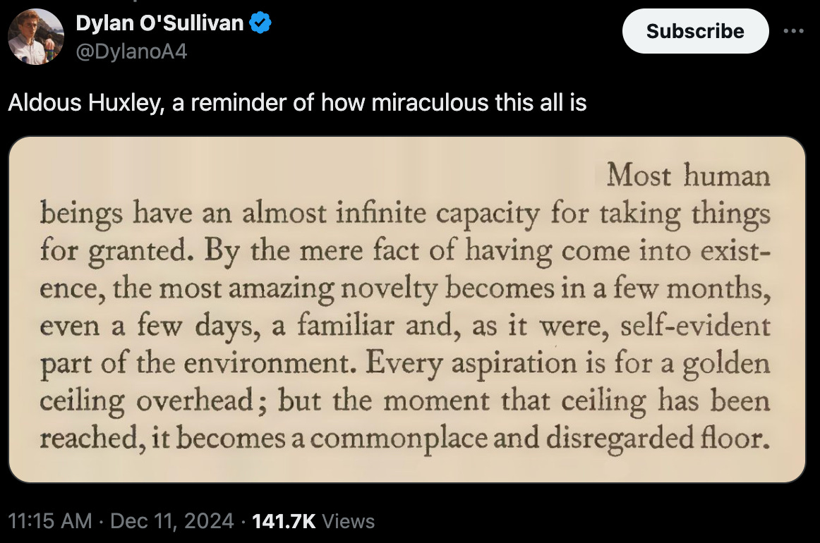The Intellectual Obesity Crisis - Speaking of junk food, this is an explanation of the mental version. The internet is filled with information, and all of this “gossip, trivia, clickbait, hackery, marketing, churnalism, and babble” acts on our brain just like sugar: it produces craving and provides no nutrition. I have been thinking a lot lately about the so-called liminal spaces in my day.. the in-between times I too frequently fill with podcast listening or scrolling. The reason so many thoughts come to us in the shower is because there’s time for our mind to wander.