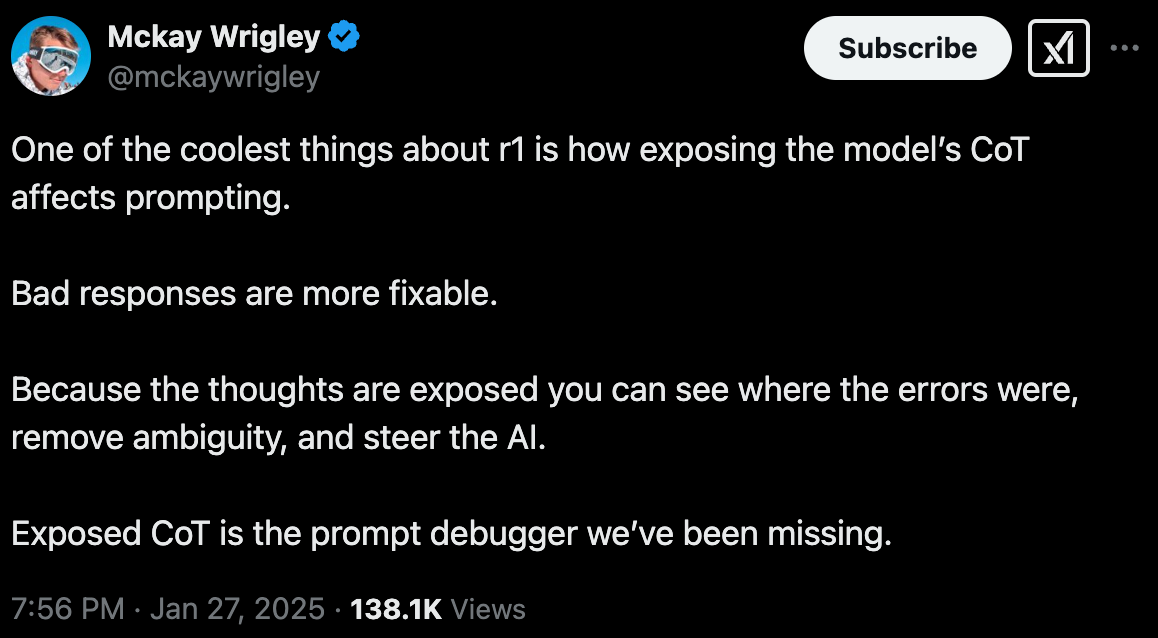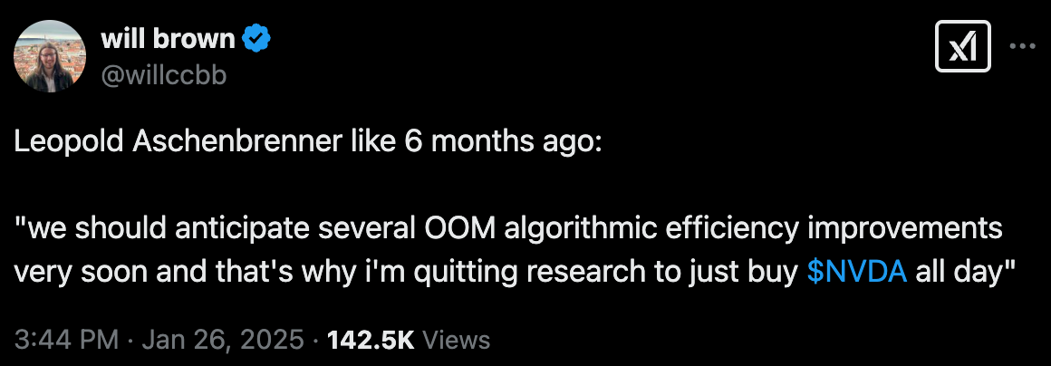 A new model from China called DeepSeek R1 upstaged Trump’s second week in office and trashed almost a trillion dollars in market cap in the process. NVDA 0.00%↑ alone lost $600 billion. But don’t worry! Everyone learned all about Jevons paradox this week too so buy your dips and your Calls now!