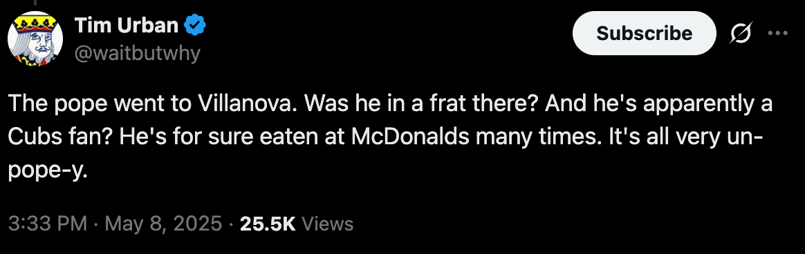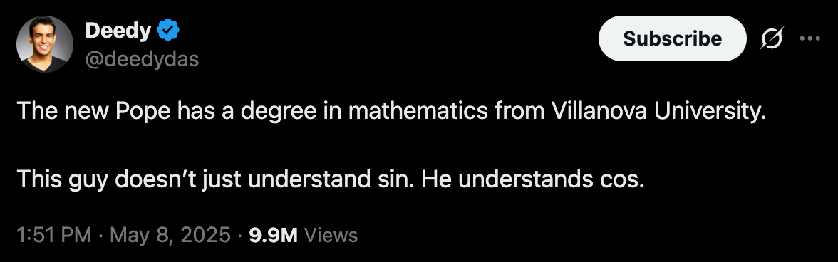 There were many good reactions.. Villanova is going to be insufferable, as they should be. And so is Chicago. And he has a math degree, which also leads to good jokes. But my favorite might have been “yoooo we got a Pope that’s been to Walmart now.” Very important. Very global.