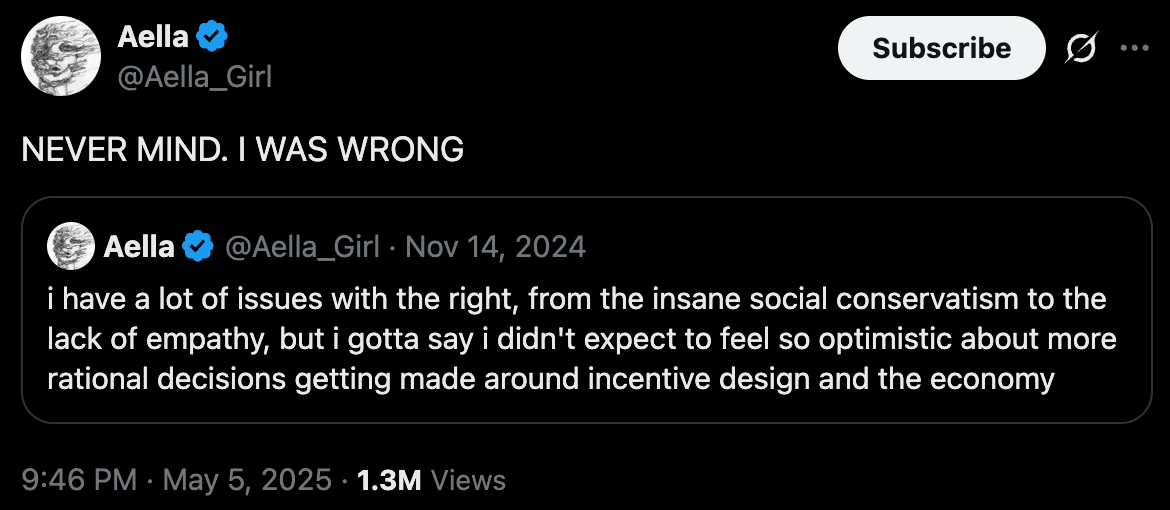 We also have a US-UK trade deal (UK is only 3% of trade btw), China and the US actually talking now, NVidia reworking their chips to deal with new export controls even as they say that China is not behind, Canadian PM Carney meeting in the Oval Office, and Trump smiling when he says “Canada is not for sale”, the Met Gala doing it’s whole over-the-top thing, a man trying to pet a bison in Yellowstone, Fiverr CEO saying AI is coming for everyone’s jobs, Bitcoin back over $100K, a potential new MAHA Surgeon General in Dr. Casey Means, a Pakistan-India war that was on nobody’s bingo card for 2025, and seemingly no progress in Ukraine/Russia. We’ve even got brand new stem cells for the soon to be de-extinct Tasmanian tiger.