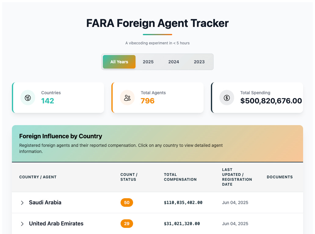 The process was awesome. I scraped 8,000+ government PDFs from 2023-2025, fed them to OpenAI to extract agent names, payments, and foreign principals, setup a dashboard view with Elixir and Phoenix, bought a domain, and deployed to production.