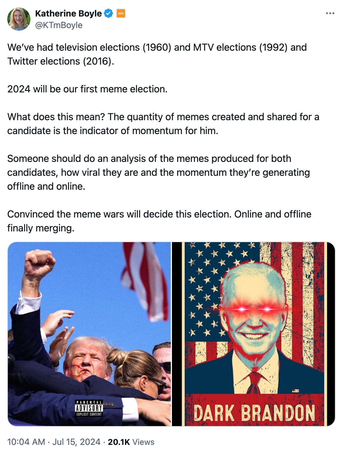 When Martin Gurri wrote The Revolt of the Public in 2013 he explained how the internet opened up the information pipelines. We've gone from a handful of curated media streams to an explosion of data and subjective unfiltered opinion smeared all over the internet. Katherine Boyle claimed this was the first meme election.