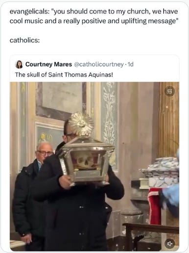 In a rather indirect way, the depth of analysis that Aquinas developed was a part of the process that led me to become Catholic. I had always felt that the simpler faith I saw in most Protestant or Evangelical churches was incomplete and incapable of handling the complexity of reality — of “everything that is the case” as Wittgenstein famously said. I saw this meme last year on the 750th Anniversary of Aquinas’ death and laughed out loud: